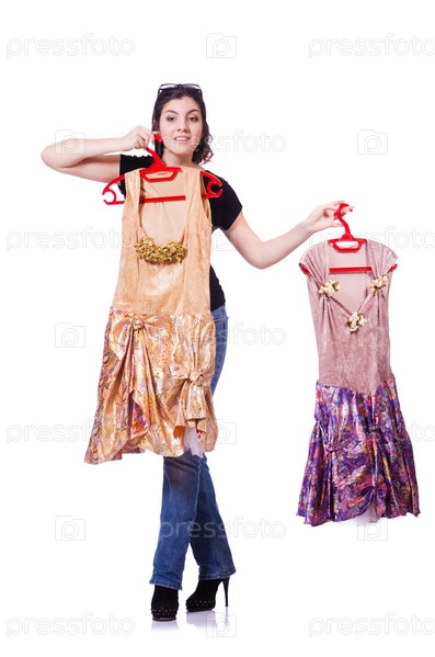 Женщина пытается выбрать платье на белом фоне