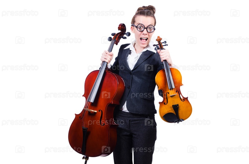 Бизнес-леди с виолончелью, изолированная на белом