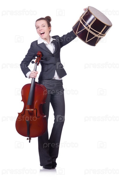 Бизнес-леди с виолончелью, изолированная на белом