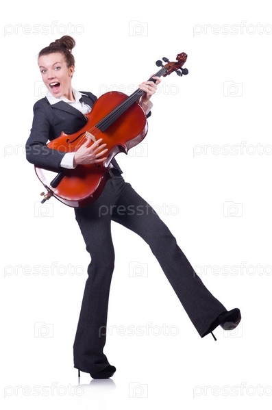 Бизнес-леди с виолончелью, изолированная на белом