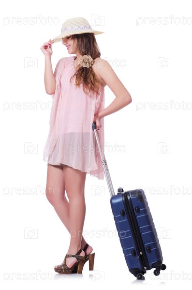 Молодая женщина с чемоданом, изолированная на белом