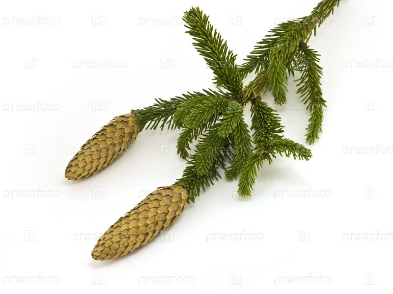 Еловая ветка с двумя шишками на белом фоне