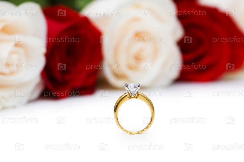 Золотое кольцо с бриллиантом на фоне роз