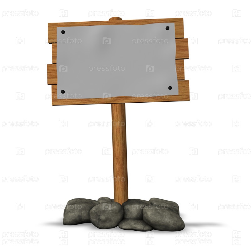 Деревянный знак с листом бумаги и камнями - 3d иллюстрация