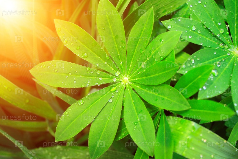 Капли дождя на зеленые листьях