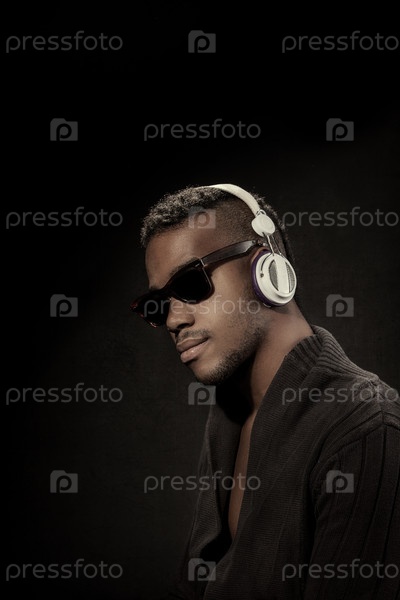 Темнокожий парень слушает музыку в наушниках