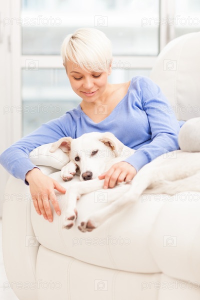 Женщина с молодой собакой сидит на диване