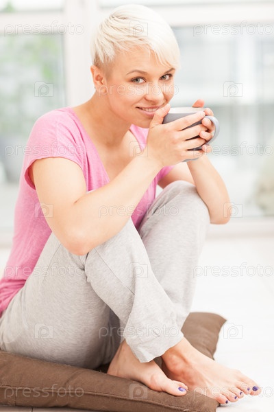 Улыбающаяся женщина с кружкой сидит дома