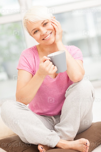Улыбающаяся женщина с кружкой сидит дома