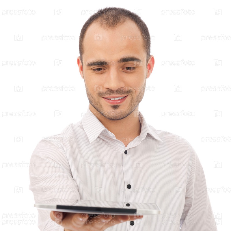 Красивый мужчина держит планшетный компьютер, изолированный на белом фоне