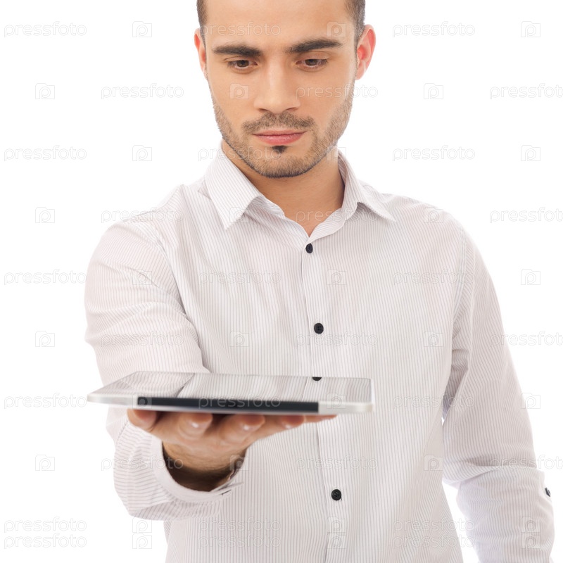 Красивый мужчина держит планшетный компьютер, изолированный на белом фоне