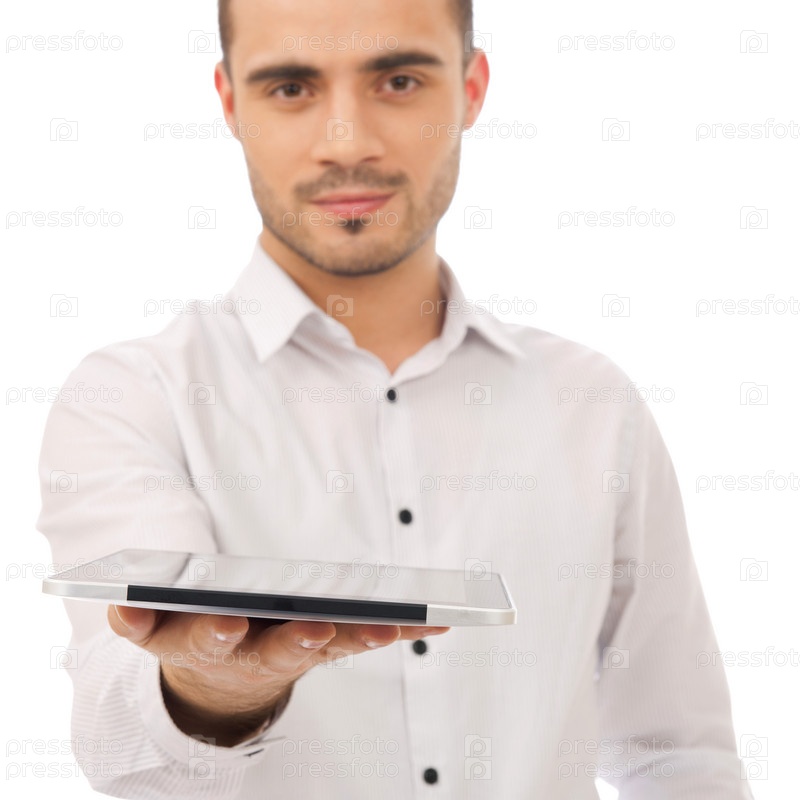 Красивый мужчина держит планшетный компьютер, изолированный на белом фоне