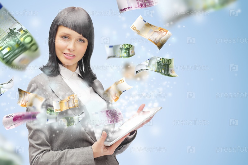 Портрет брюнетка с планшетным компьютером. Деньги, появляющиеся из экрана. Концепция онлайн торговли