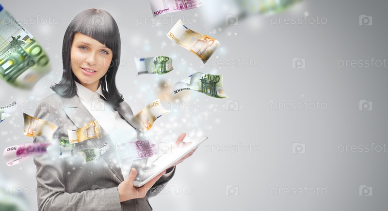 Портрет брюнетка с планшетным компьютером. Деньги, появляющиеся из экрана. Концепция онлайн торговли