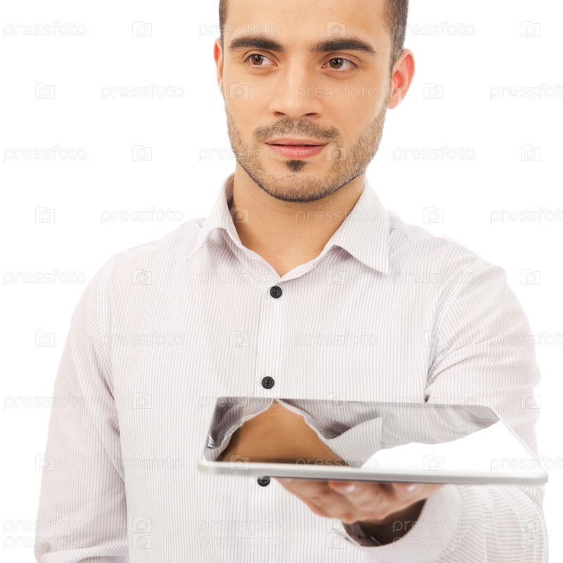 Красивый мужчина держит планшетный компьютер, изолированный на белом фоне
