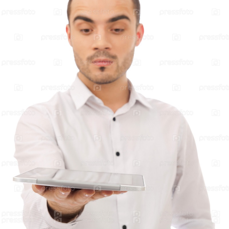 Красивый мужчина держит планшетный компьютер, изолированный на белом фоне