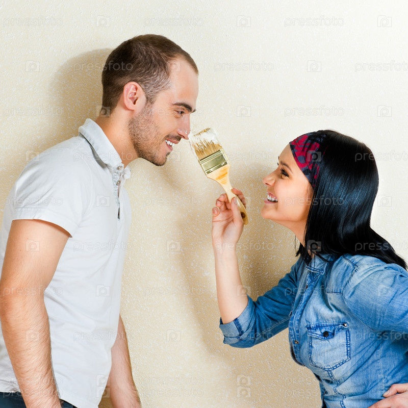 Счастливая молодая пара красит дом