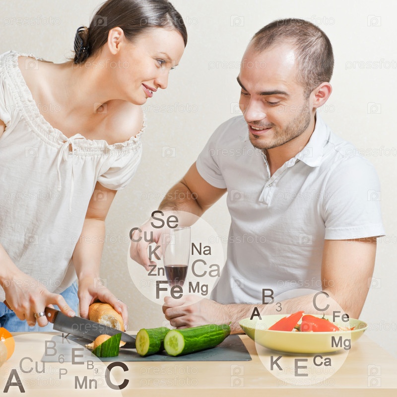 Молодая пара готовит сбалансированный рацион. Витамины и микроэлементы на фоне