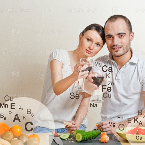 Молодая пара готовит сбалансированный рацион. Витамины и микроэлементы на фоне