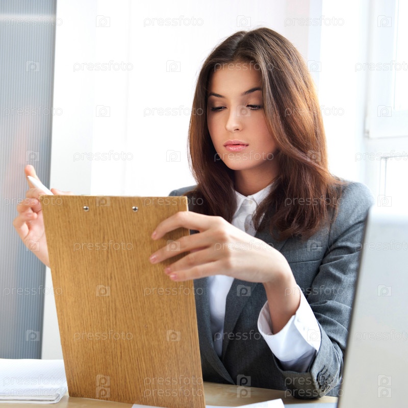 Портрет молодой женщины с документами в руке в офисе