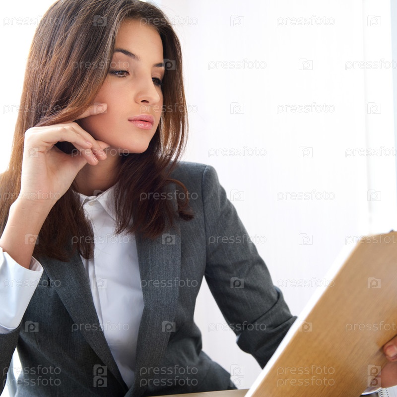 Портрет молодой женщины с документами в руке в офисе