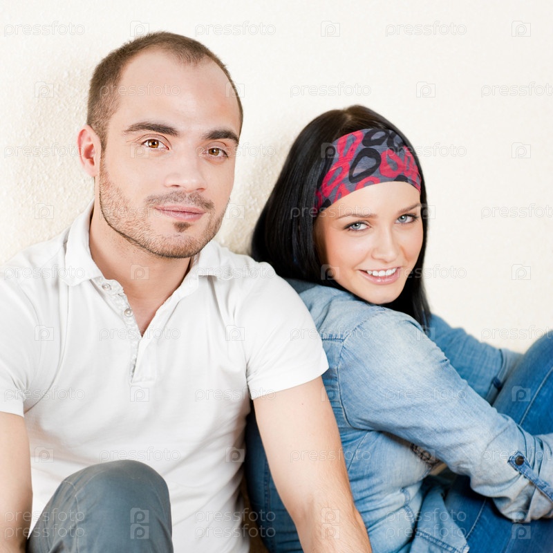 Привлекательная молодая пара сидит на полу дома