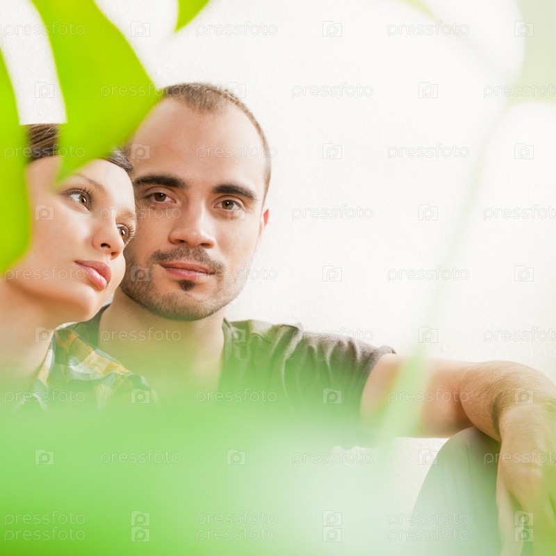 Привлекательная молодая пара сидит на полу в доме. Листья цветка на переднем плане