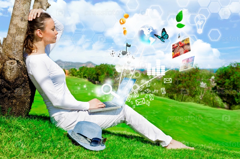 Симпатичная женщина сидит у дерева с ноутбуком