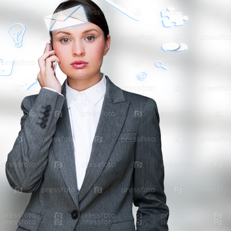 Бизнес-леди с телефоном и иконками вокруг головы