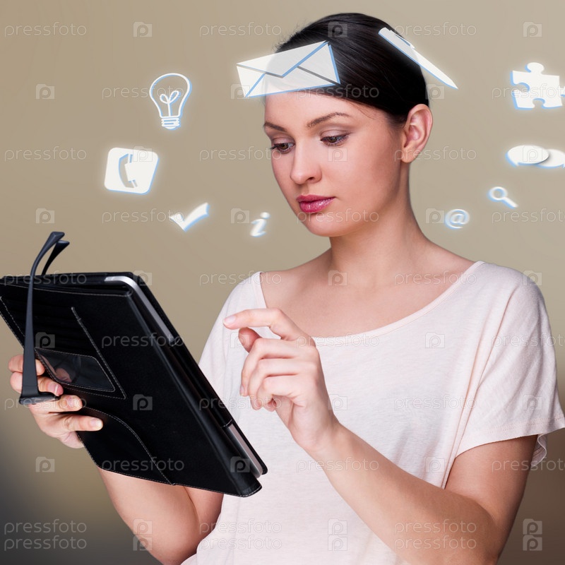 Бизнес-леди с планшетным компьютером и иконками вокруг головы