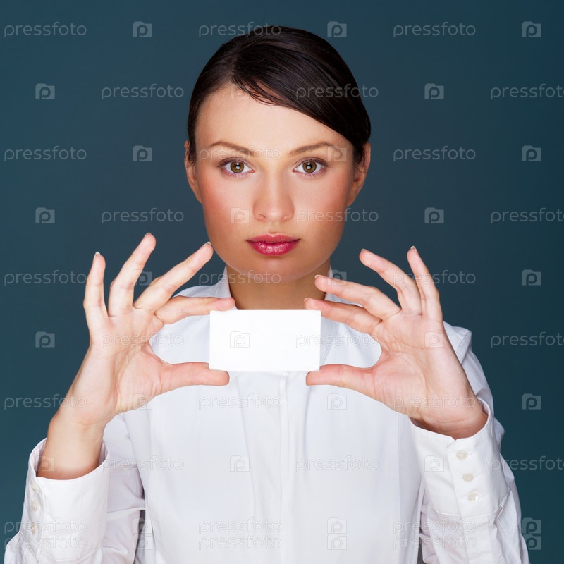 Молодая деловая женщина показывает свою визитную карточку, сидя в офисе