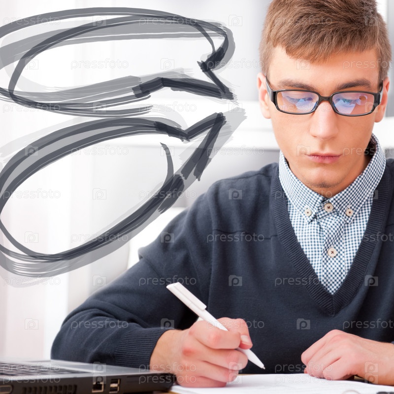Старшеклассник делает заметки в классе. Пустые воздушные шары для его мыслей вокруг его головы