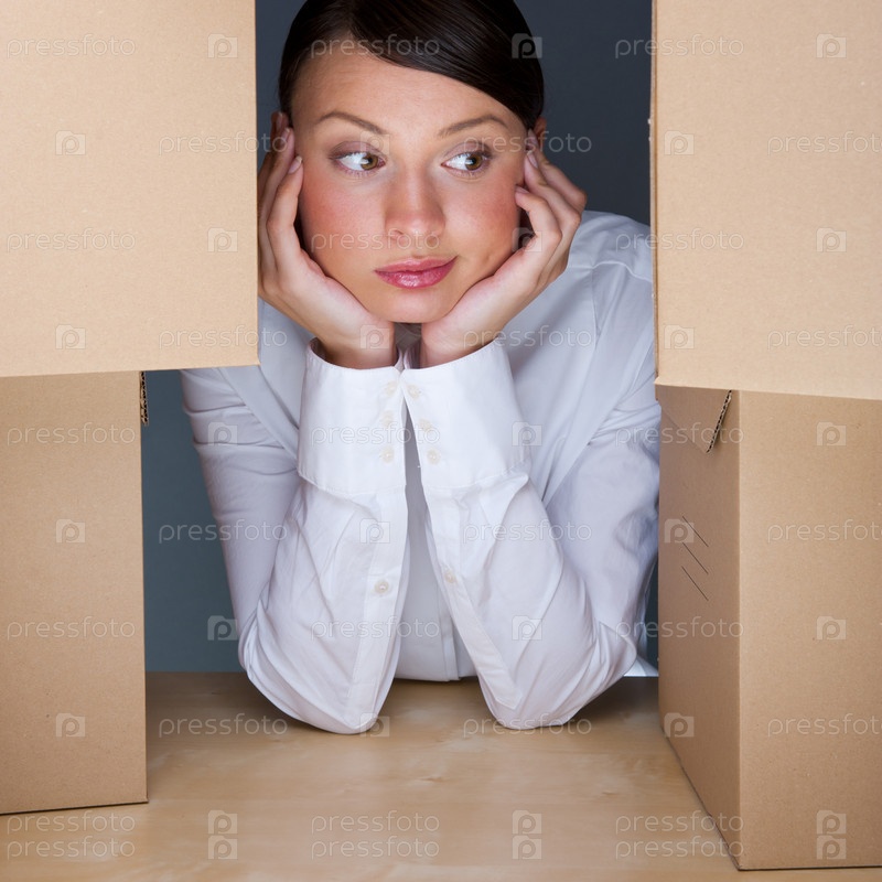 Портрет молодой женщины, окруженной коробками. Много работы