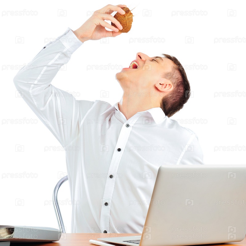 Молодой мужчина сидит с ноутбуком за столом и пьет кокосовый сок. Заказ билетов онлайн. Концепция