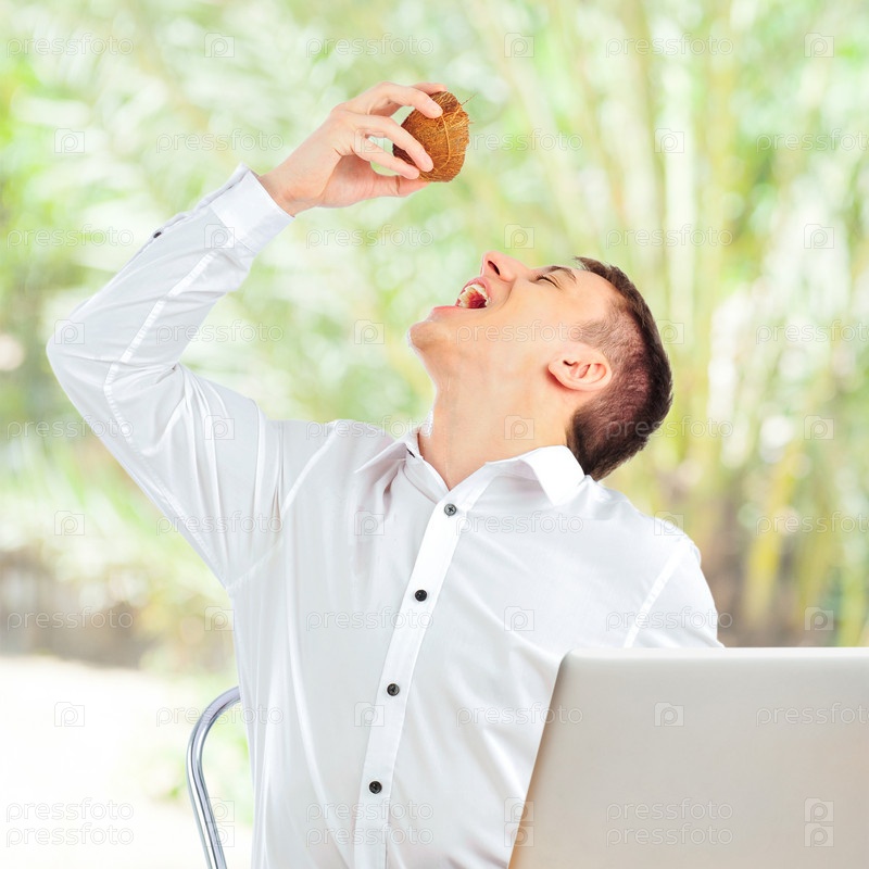 Молодой мужчина сидит с ноутбуком за столом и пьет кокосовый сок. Заказ билетов онлайн. Концепция