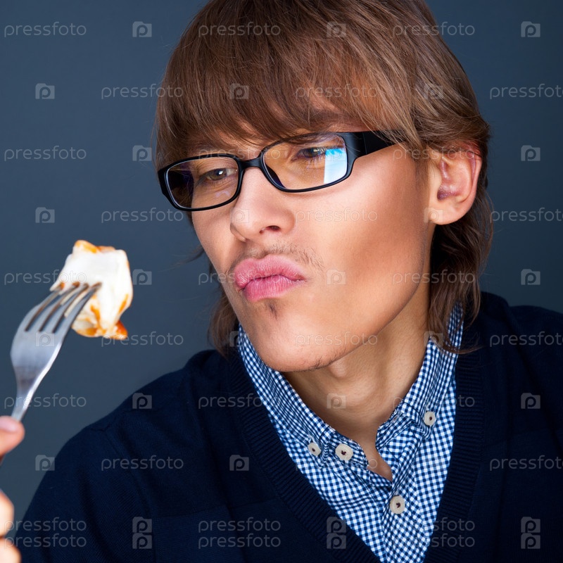 Гламурный мужчина ест русскую традиционную еду с вилки