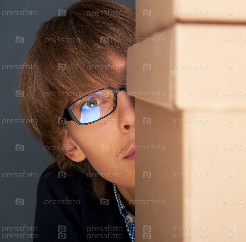 Портрет молодого мужчины с коробкой на фоне серой стены. Он начинает новую жизнь