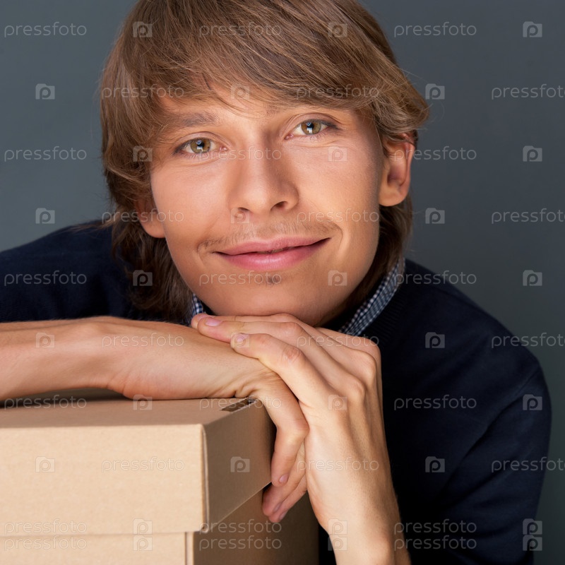 Портрет молодого мужчины с коробкой на фоне серой стены. Он начинает новую жизнь