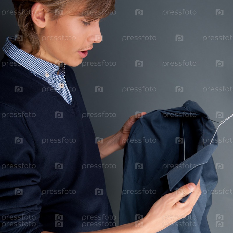 Портрет мужчины, выбирающего рубашку на сером фоне в магазине