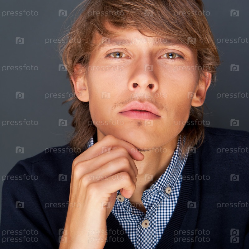 Портрет молодого человека с мудрым взглядом и рукой на подбородке