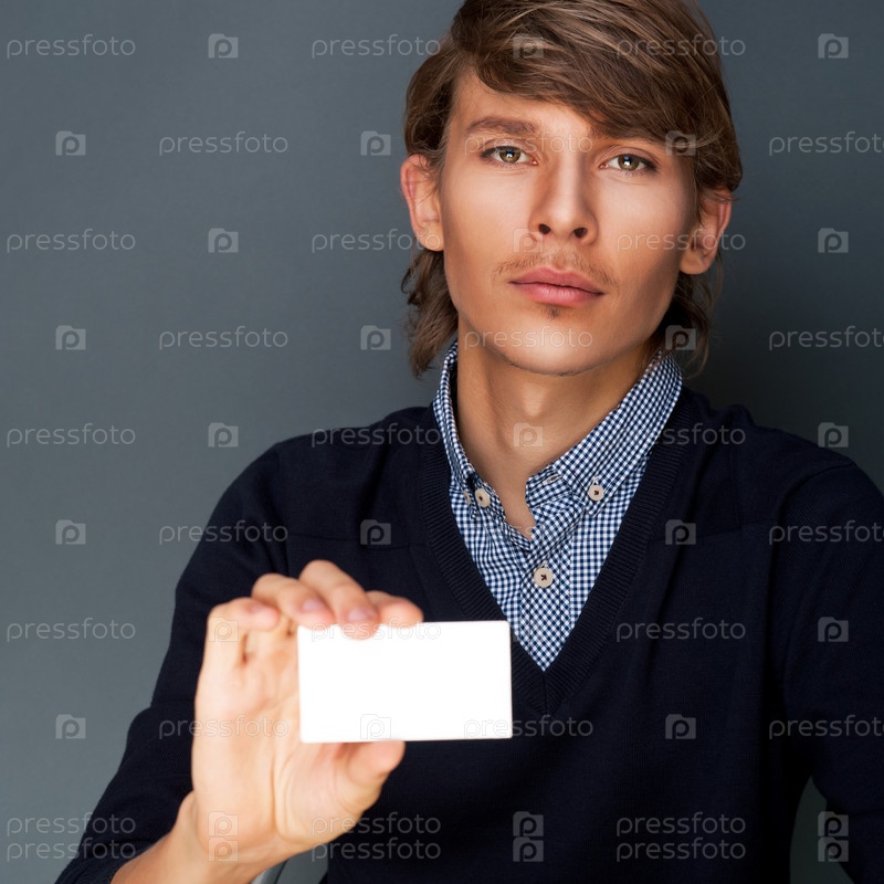 Портрет молодого красивого делового человека, держащего пустую белую визитную карточку, сидя спокойно в офисе