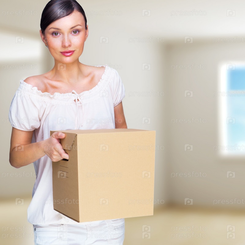 Улыбающаяся женщина с коробкой в доме. Концепция ипотеки и переезда