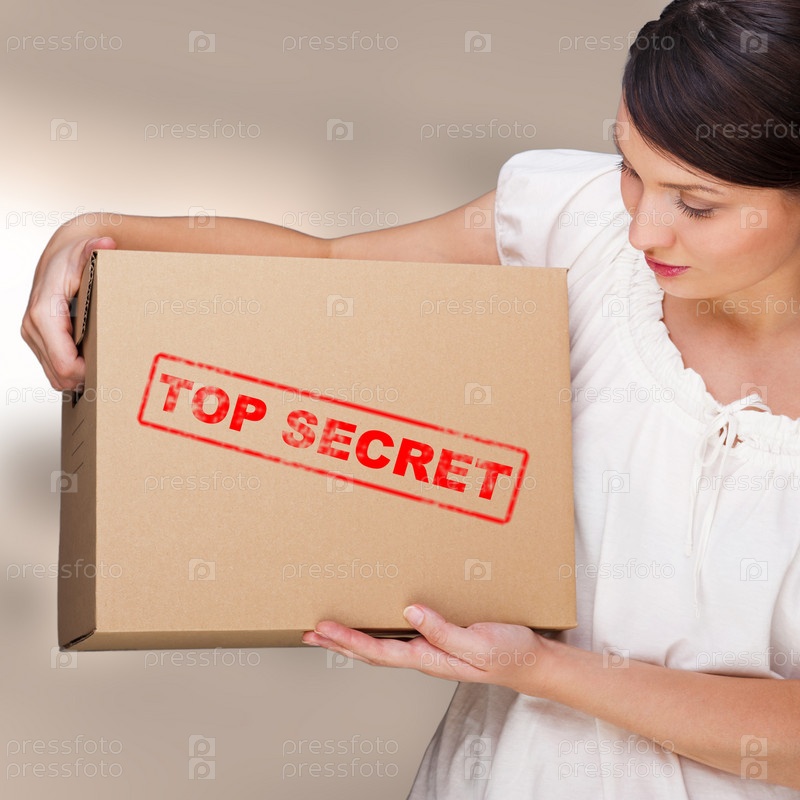 Портрет молодой красивой женщины с картонной коробкой, содержащей важную информацию под грифом Секретно