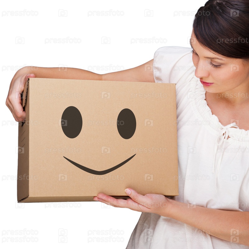 Привлекательная женщина с коробкой для переезда со смайлом. Беззаботный, легкий переезд