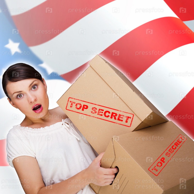 Портрет молодой красивой женщины с секретной информацией в картонных коробках на фоне флага США