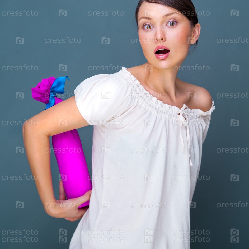 Портрет молодой красивой женщины, держащей бутылку вина в подарочной упаковке