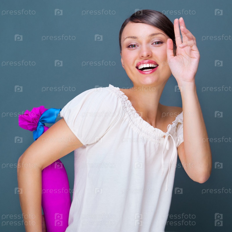 Портрет молодой красивой женщины, держащей бутылку вина в подарочной упаковке