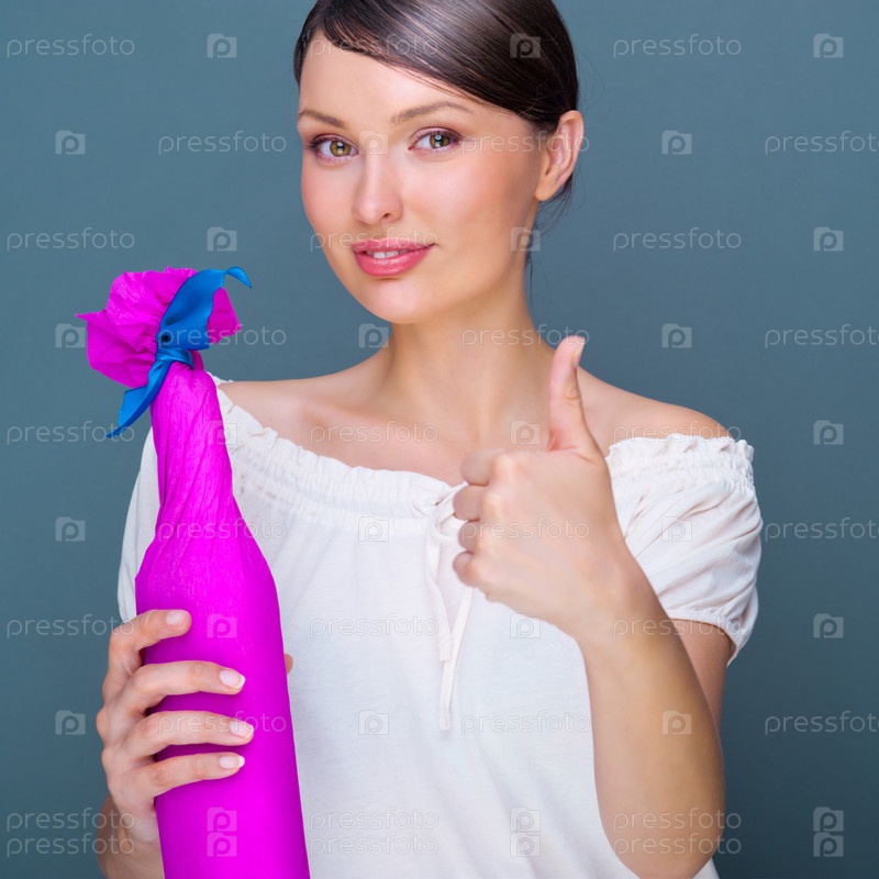 Портрет молодой красивой женщины, держащей бутылку вина в подарочной упаковке