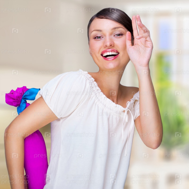 Портрет молодой красивой женщины, держащей бутылку вина в подарочной упаковке