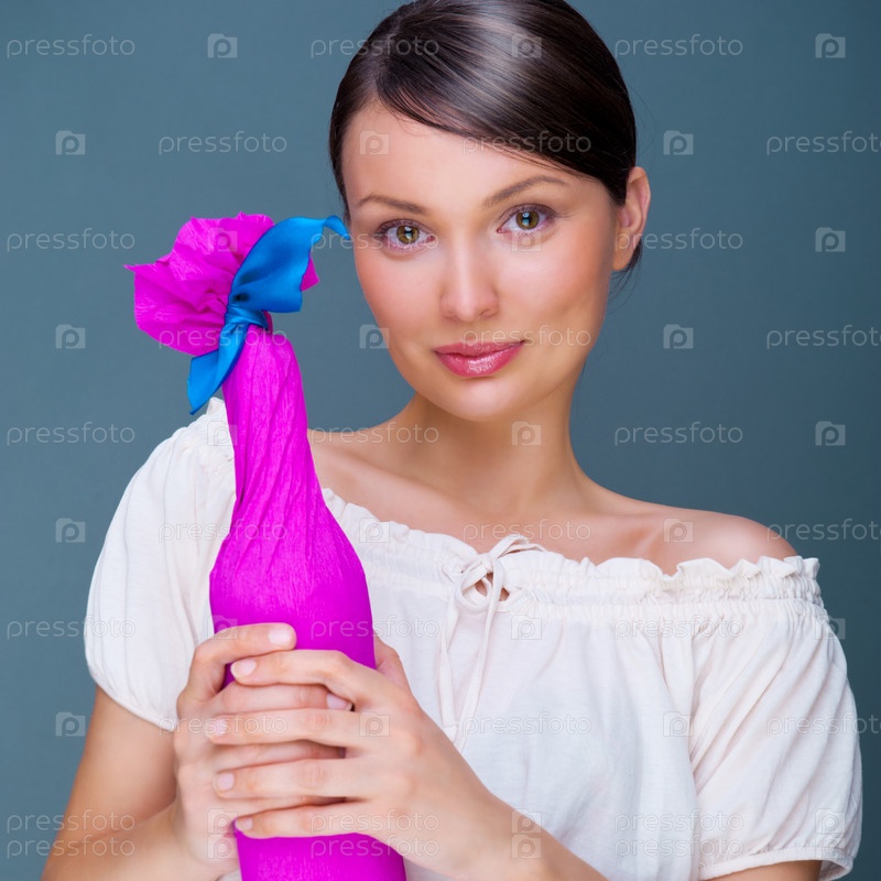 Портрет молодой красивой женщины, держащей бутылку вина в подарочной упаковке